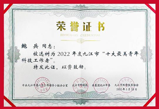 近日,中共九江市委人才工作领导小组办公室、九江市科学技术局、共青团九江市委、九江市科学技术协会联合下发了《关于选树2022年九江市“十大最美科技工作者”、“十大最美青年科技工作者”、“十大最美科普工作者”的决定》,经个人自荐、组织推荐、资格审查、综合评定等程序,九江学院附属医院鲍兵医师脱颖而出,荣获2022年九江市“十大最美青年科技工作者”。