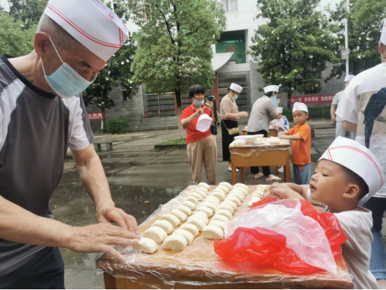 活动广泛邀请了社区的老年人、孩子们和九江学院关工委“五老”(老干部、老战士、老专家、老教师、老模范)代表共同参与。在活动现场,很多是祖辈带着孙辈前来参加活动,年龄最小的3岁多点,年龄最长者则有75岁。活动中,长者态度认真地投入其中、一边教一边做,时不时地关注一下“小手”;幼者则有样学样,将面团在小手中拿捏,时不时地将其在桌案上搓压,开心的笑容挂满了小脸。