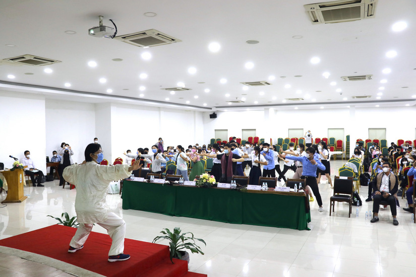 中国援柬埔寨中医抗疫医疗队队长樊茂蓉带来的《如何应用中医药防治呼吸系统疾病》专业讲座,详细地讲解了中国传统中医药防治呼吸系统疾病的优势和常用的家庭食疗方法。援柬中医抗疫医疗队的苏博医生利用多媒体、视频和图片等形式,讲解了八段锦的含义、特点、功效和动作分解,并现场带来沉浸式教学。李小红护士演示和传授了八段锦的招式。观众们对此非常感兴趣,跃跃欲试,大家在专家的带领下,一招一式,集体练习八段锦,将现场气氛推向高潮。来自25级的Heng Soucheng王素贞同学表示,这次活动让她学到了中医的一些知识,坚定了学习汉语的决心和信心,今后将更好地服务中柬文化交流。