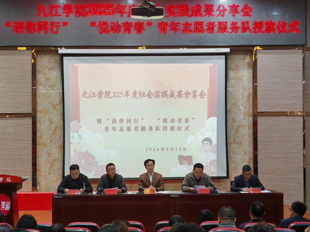 4月15日下午,九江学院2025年度社会实践成果分享会暨“语你同行”“悦动青春”青年志愿者服务队授旗仪式圆满举行。校党委委员、副校长吴维勇出席并讲话,校团委主要负责同志,党委宣传部、教务处相关负责同志,各二级学院党委副书记、团委书记、社会实践指导教师代表、实践团队代表、志愿者代表等300余人参会。